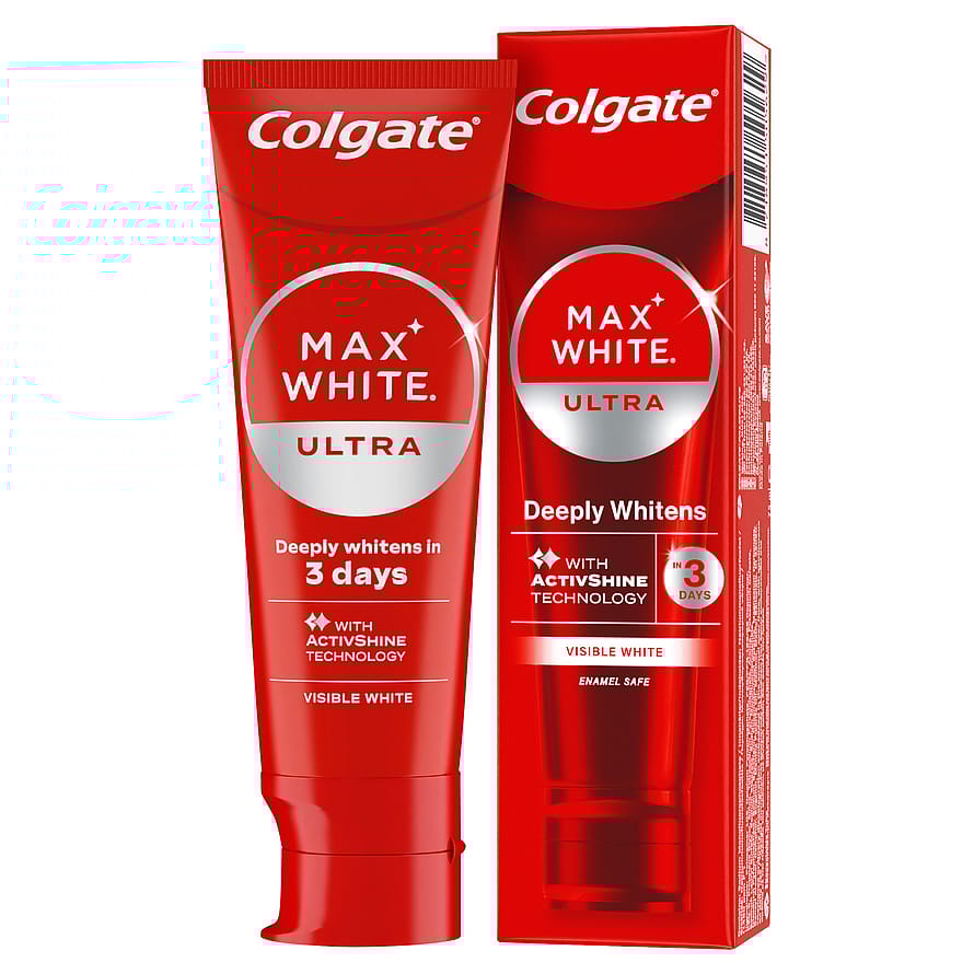 Colgate Max White Ultra Visible White tandpasta bleger i dybden med aktive iltmolekyler og giver hvidere tænder på kun 3 dage*.
