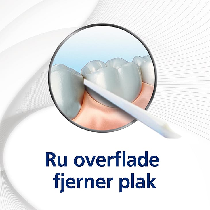 Ru overflade, der effektivt fjerner plak. Afrundet form, der er skånsom mod tandkødet. Bøjelig og splintfri. Kan bøjes til siderne.
