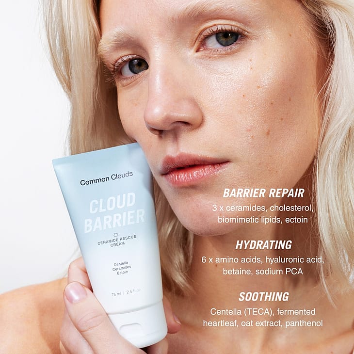 Cloud Barrier Ceramide Rescue Cream er en intensivt fugtgivende, lindrende og barrieregenopbyggende creme til tør, sensitiv eller svækket hud efter aknebehandling eller overeksfoliering.