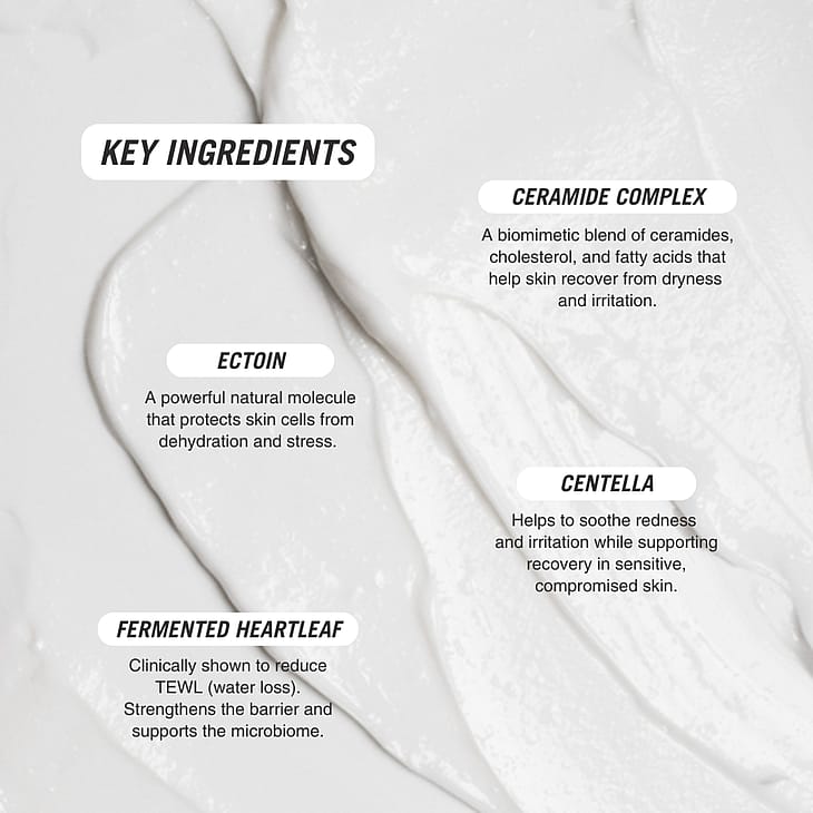 Nøgleingredienser: Ceramider, ectoin, centella Aqua, Glycerin, Cetearyl Alcohol, Squalane, Caprylic/Capric Triglyceride, Dimethicone, Simmondsia Chinensis Seed Oil, Panthenol, Hydrogenated Ethylhexyl Olivate, Bacillus/Houttuynia Cordata Extract Ferment Filtrate, Glyceryl Stearate, PEG-100 Stearate, Cholesterol, Ceramide NP, Tocopherol, Lactic Acid, Phenoxyethanol, Betaine, Tocopheryl Acetate, Hydroxyethyl Acrylate/Sodium Acryloyldimethyl Taurate Copolymer, Ectoin, Sodium Lauroyl Lactylate, Butylene Glycol, Hydrogenated Olive Oil Unsaponifiables, Sodium PCA, Avena Sativa Kernel Flour, Ethylhexylglycerin, Sodium Hyaluronate, Sodium Lactate, Lecithin, Sclerotium Gum, PCA, Asiatic Acid, Madecassic Acid, Polysorbate 60, 1, 2-Hexanediol, Asiaticoside, Serine, Alanine, Glycine, Citric Acid, Biosaccharide Gum-1, Ceramide AP, Phytosphingosine, Sorbitan Isostearate, Pantolactone, Xanthan Gum, Carbomer, Glutamic Acid, Sodium Levulinate, Lysine HCl, Threonine, Glyceryl Caprylate, Arginine, P-Anisic Acid, Alcohol, Proline, Ceramide EOP