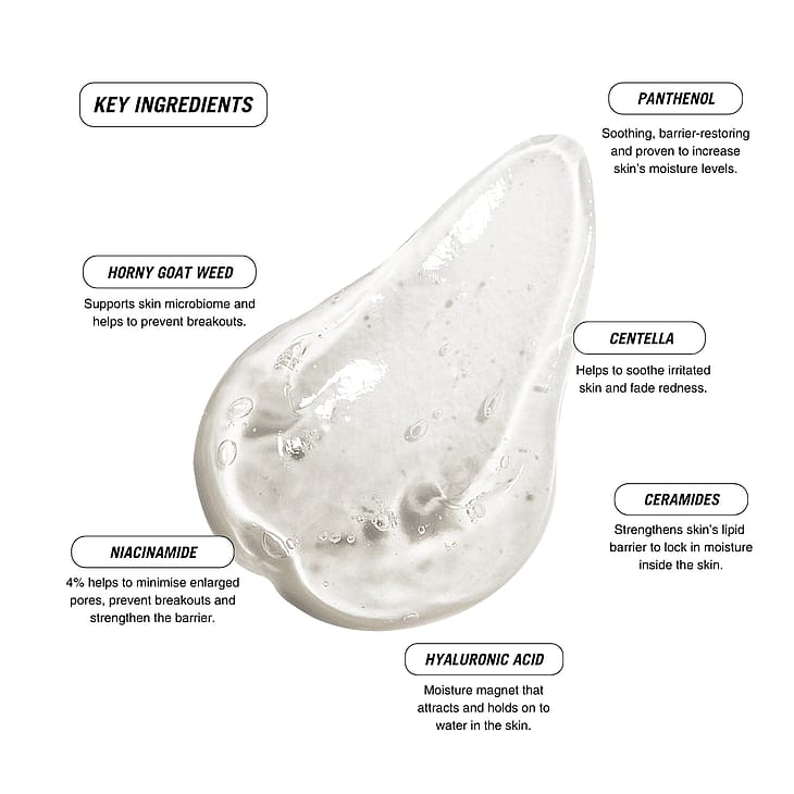 Aqua, Propanediol, Glycerin, Niacinamide, Panthenol, Centella Asiatica Leaf Extract, Sodium Hyaluronate, Pantolactone, Xanthan Gum, Butylene Glycol, Acrylates/C10-30 Alkyl Acrylate, Crosspolymer, Glyceryl Acrylate/Acrylic Acid Copolymer, Phenoxyethanol, Ethylhexylglycerin, Sodium Hydroxide, Glycyrrhiza Uralensis Root Extract, Pentylene Glycol, Phospholipids, Epimedium Sagittatum Leaf/Stem Extract, Sphingolipids, Sodium Benzoate, Citric Acid, Potassium Sorbate