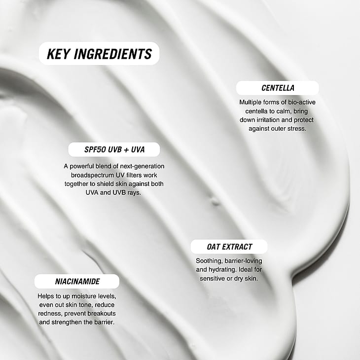 Med formlen kombineres seneste generation af UV-filtre med over 70 % fugtgivende ingredienser. Centella asiatica, havre og artiskok beroliger huden, mens glycerin og niacinamid giver et fugt-boost og styrker hudbarrieren. Ikke-irriterende, ikke-tilstoppende formel velegnet til sensitiv hud med tendens til akne. Duftfri.
