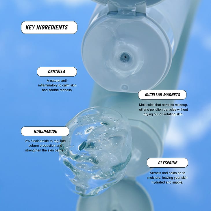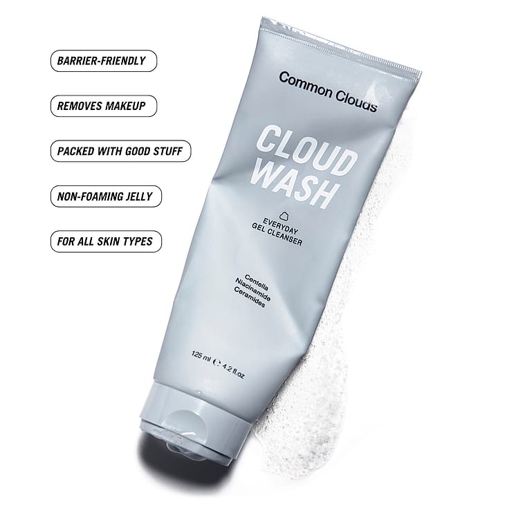 Cloud Wash indeholder fugtgivende glycerin, lindrende centella og niacinamid, der efterlader huden ren, frisk og afbalanceret.