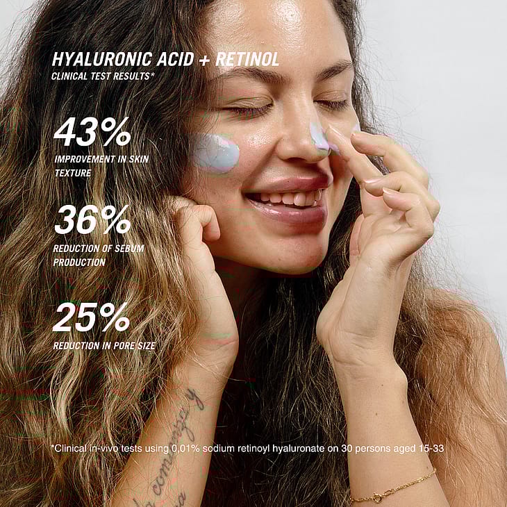 Den multifunktionelle formel indeholder en banebrydende kombination af retinsyre og hyaluronsyre, der trænger dybt ind i huden og giver alle de gavnlige fordele ved en mild retinol, uden irritation.