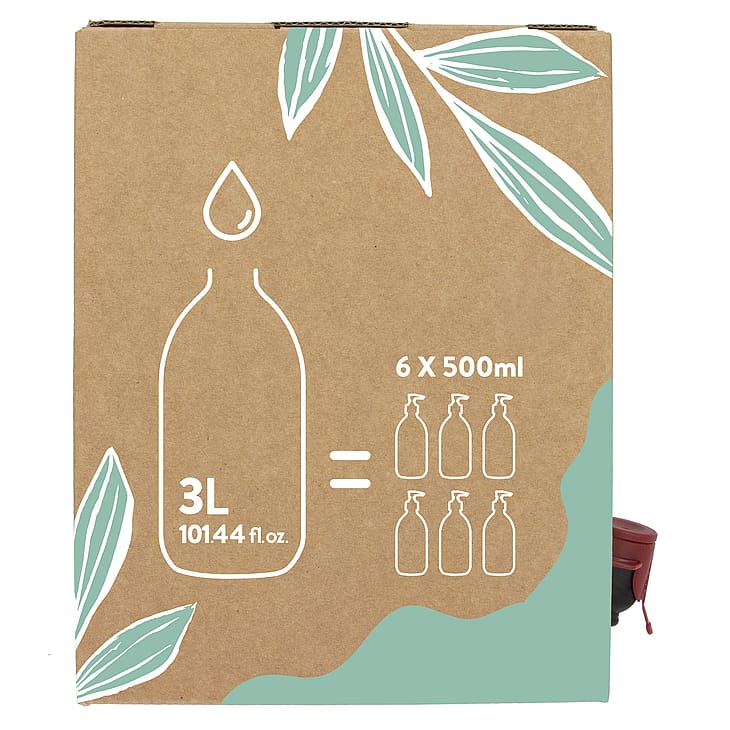 Denne 3-liters refill kan fylde en 500 ml glasflaske med flydende sæbe 6 gange og reducere vægten af plastemballage med op til 80% sammenlignet med 3 La Compagnie de Provence 1-liters refills.
