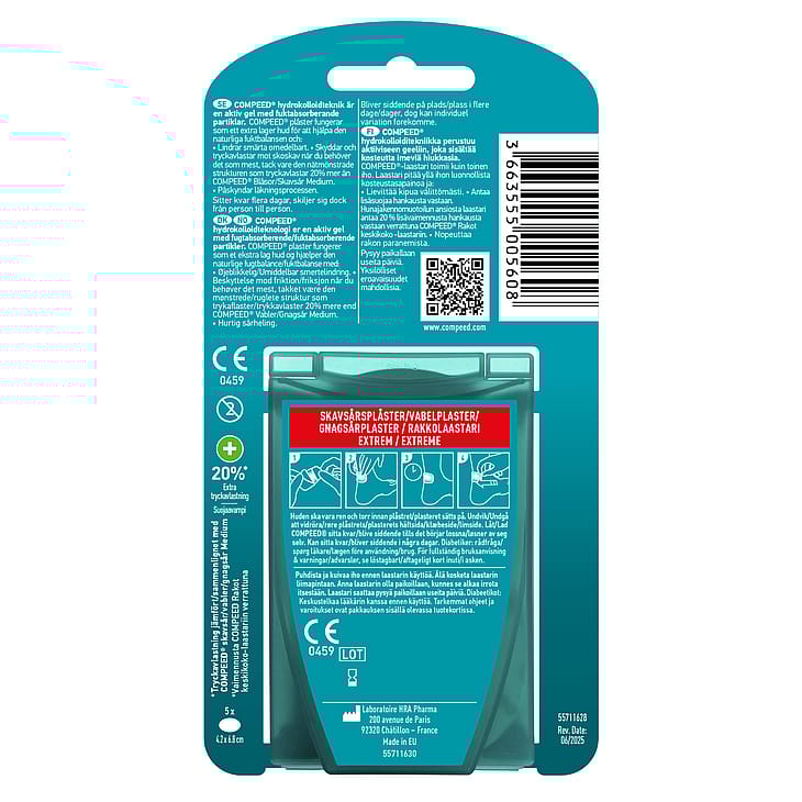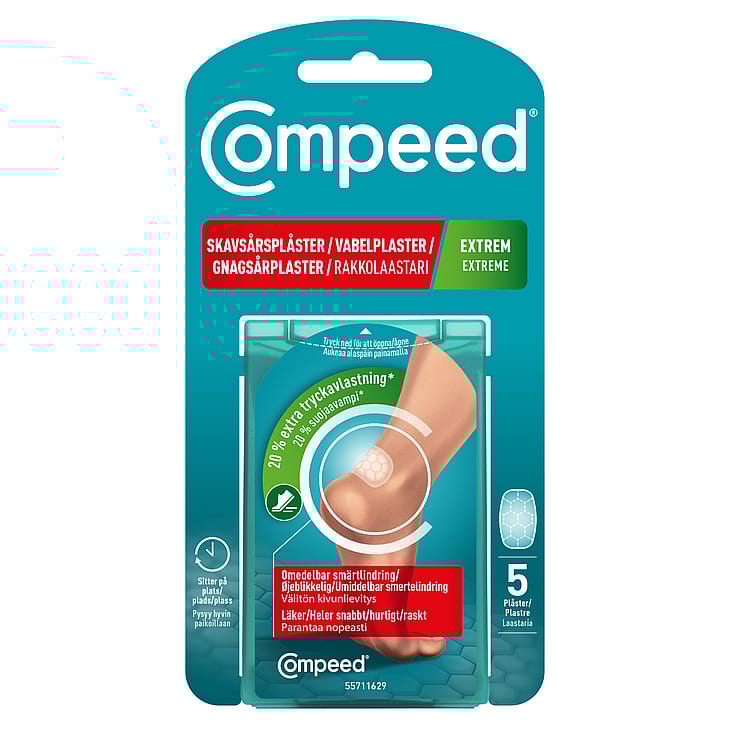 Compeed® hydrokolloidteknologi er en aktiv gel med væskeabsorberende partikler. Tyk polstring spreder trykket fra vablen, hvilket giver øjeblikkelig smertelindring. Compeed® plastre har en tyndere kant, så de former sig perfekt efter hudens overflade. Dette reducerer friktion og sikrer, at helingsprocessen ikke forstyrres af smertefuld gnidning. Kan blive siddende i adskillige dage.