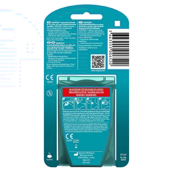 COMPEED® Vabelplaster Medium absorberer overskydende fugt og udgør beskyttende trykaflastning, hvilket giver øjeblikkelig smertelindring og optimale helingsforhold for vabler på fødderne. Fås i pakker med forskellige antal.