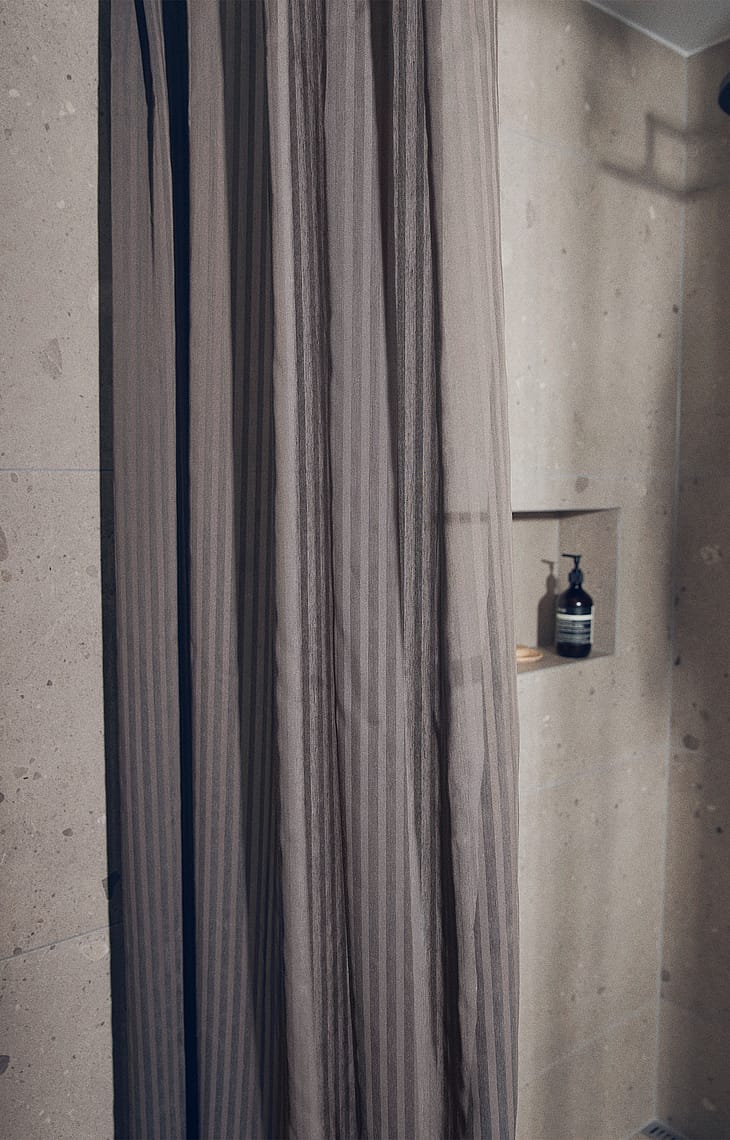 Badeforhæng i elegante transparente tone i tone vævede striber.