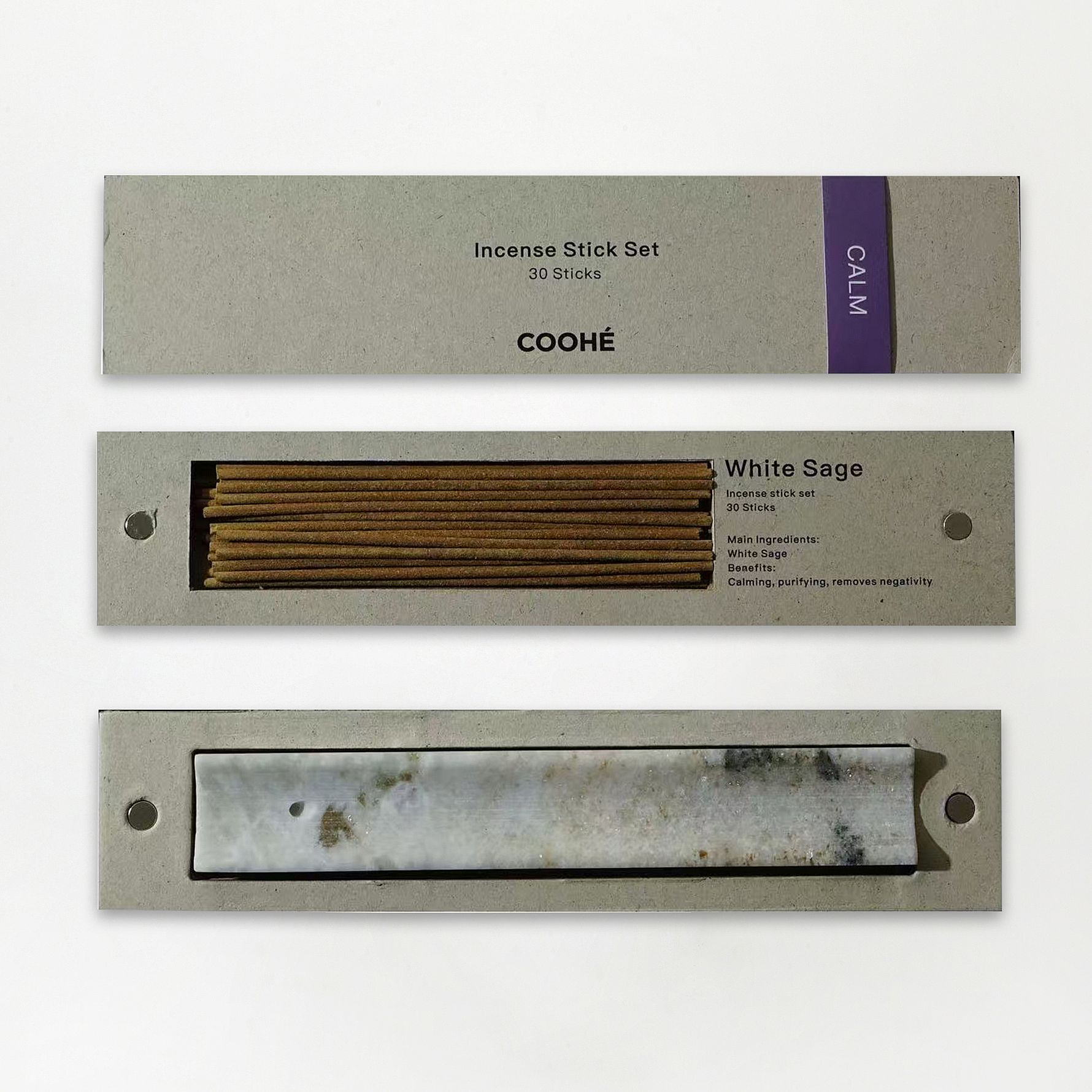 Inviter ro og klarhed ind i dit hjem med CALM – et røgelsespindesæt, der kombinerer de renende kræfter fra hvid salvie med en smuk, håndlavet marmorholder.