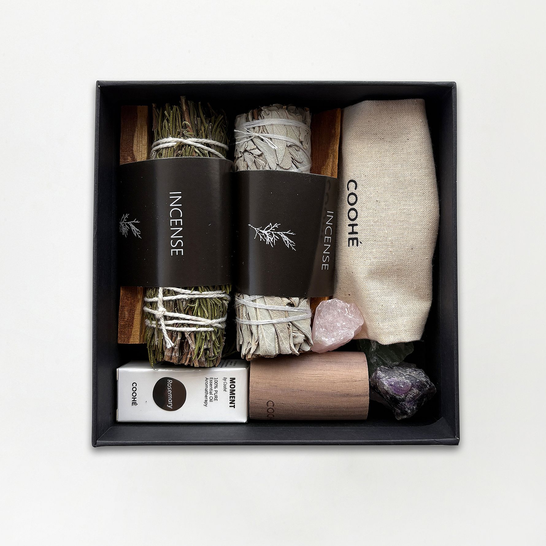 Sættet kombinerer naturlige røgelsesbundler, æterisk olie, krystaller og trædiffuser for at skabe et rum fyldt med nærvær, ro og intention.