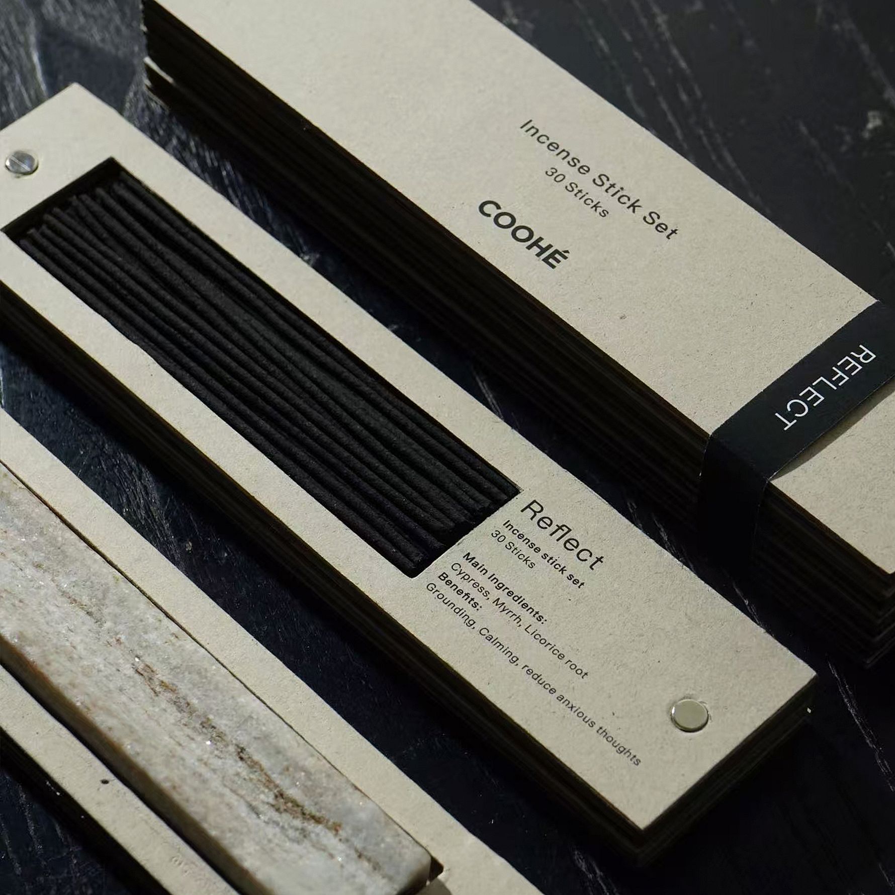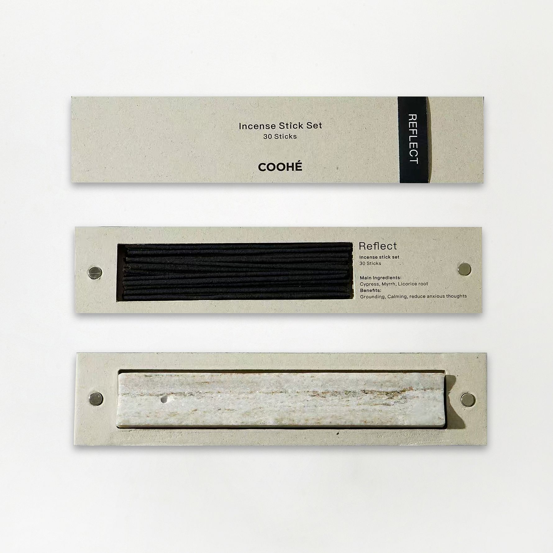 REFLECT røgelsespindesæt kombinerer de dybe, jordnære dufte fra cypress, myrrha og lakridsrod med en smuk, håndlavet marmorholder.