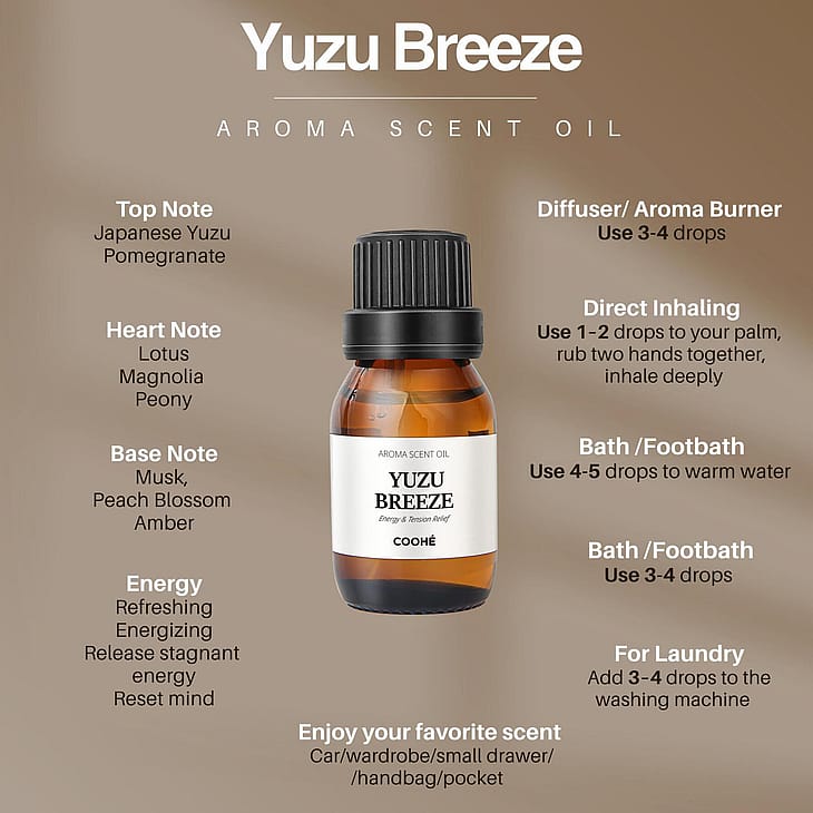 Yuzu Breeze åbner med sprøde, livlige citrusnoter af yuzu, citron og lime, som smelter sammen med varme, træagtige undertoner af sandeltræ, guaiac og cypres.