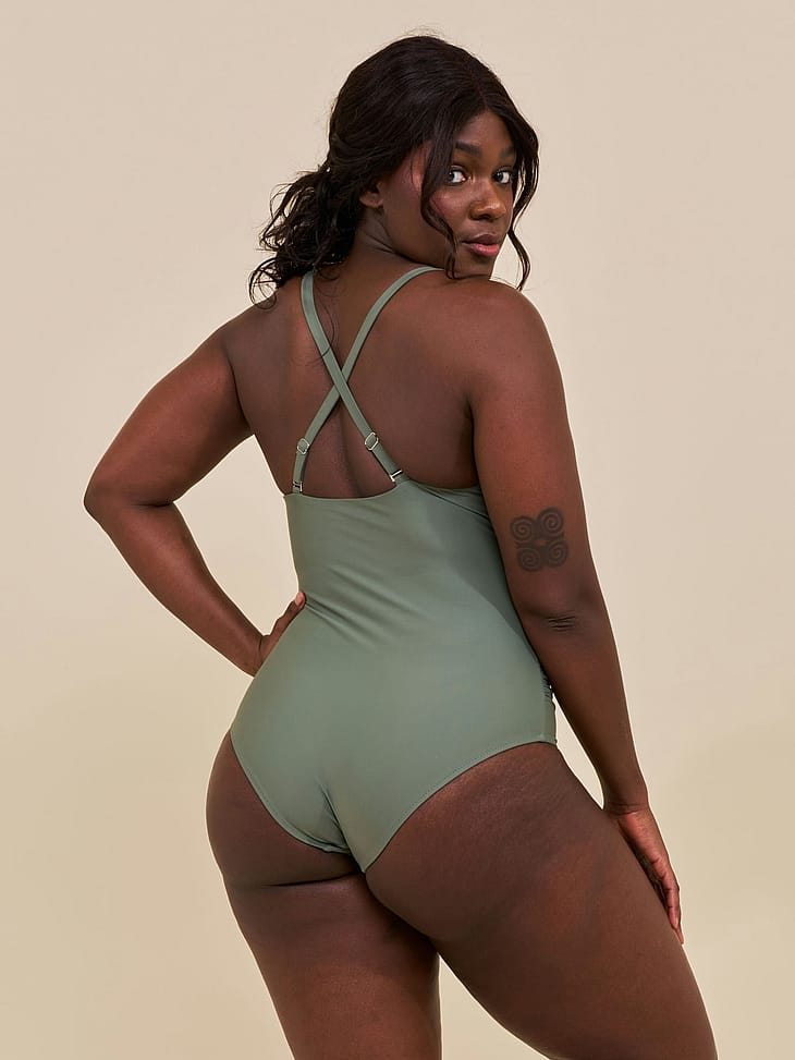 Medewi draperet badedragt er skabt af regenereret nylon mixet med elastan, som skaber et materiale der smyger sig om kroppen og giver støtte.