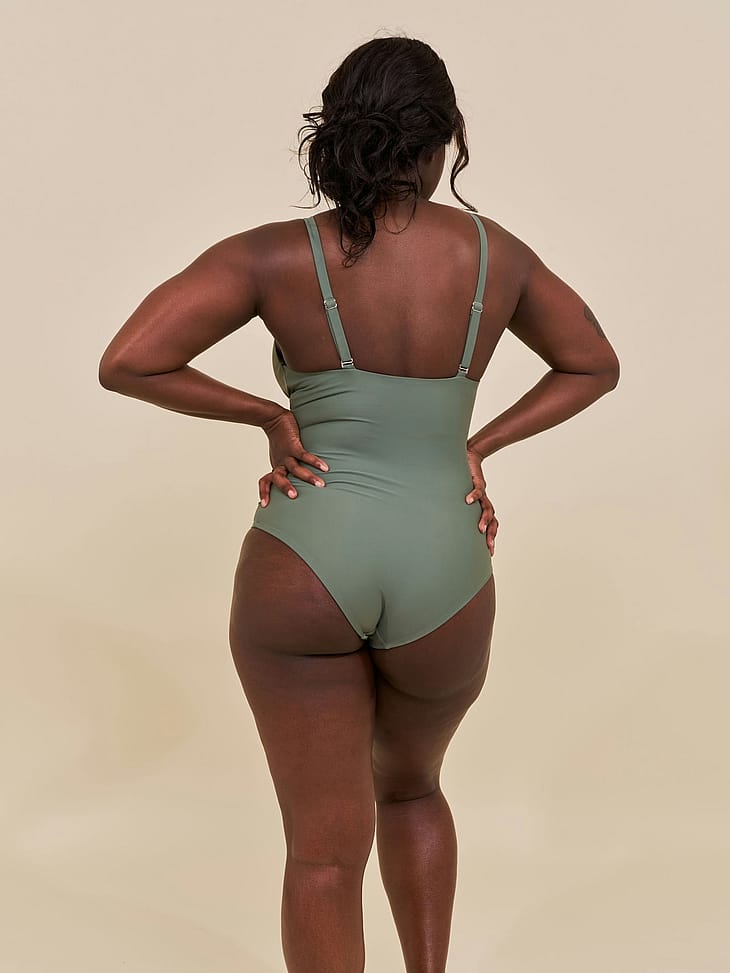 Medewi draperet badedragt er skabt af regenereret nylon mixet med elastan, som skaber et materiale der smyger sig om kroppen og giver støtte.