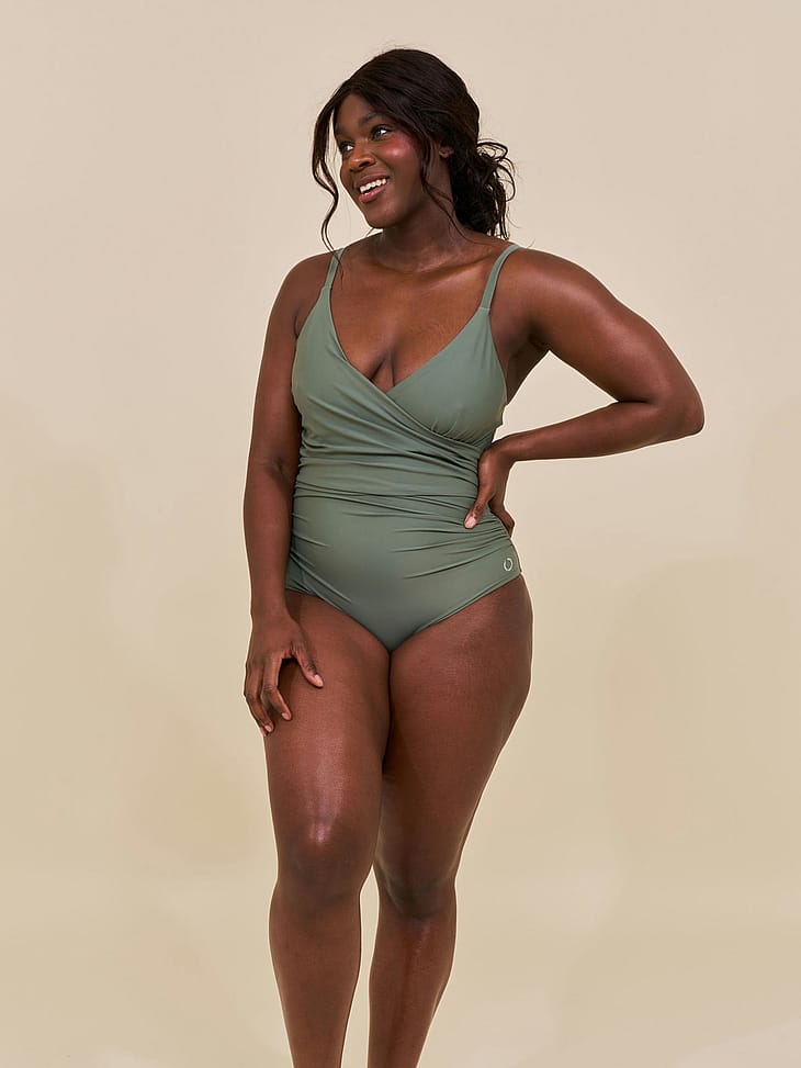 Medewi draperet badedragt er skabt af regenereret nylon mixet med elastan, som skaber et materiale der smyger sig om kroppen og giver støtte.