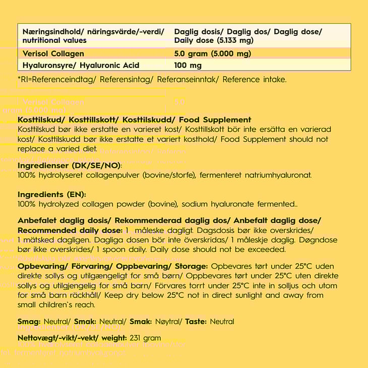 Kollagenpulver til 45 dage med en daglig dosis på 5 g kollagen – 100 mg hyaluronsyre.