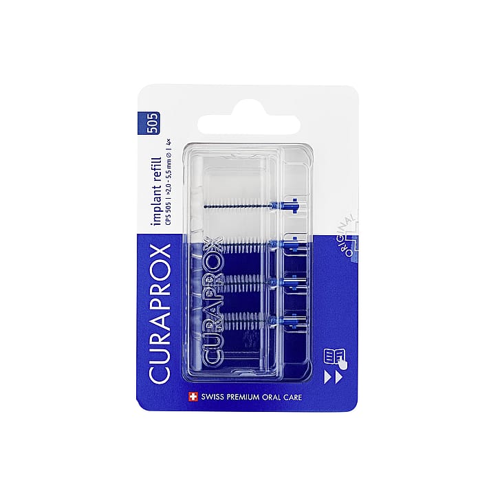 Soft Implant refill pakke 4 børster (blå) Variant: CPS 505 – 2,0 mm wire/ 5,5 mm børstehår Effektiv tandpleje Vidste du, at en almindelig tandbørste kun renser ca. 70% af dine tænder? De resterende 30% gemmer sig mellem tænderne, hvor der ofte opstår huller. Derfor er det vigtigt at bruge en mellemrumsbørste dagligt for at opnå optimal mundhygiejne. Vores mellemrumsbørstesæt indeholder 4 børster. Børsterne er designet til at være genanvendelige og nemme at udskifte takket være et praktisk kliksystem. Når børsten er slidt op, klikker du blot en refill-børste i, hvilket minimerer plastikaffald. Fordele ved produktet: Ekstremt fine børster med paraplyeffekt: Børsterne er blandt de fineste på markedet og folder sig nænsomt ud for effektivt at nå og rense selv de snævreste og skjulte tandmellemrum, hvor plak og madrester ellers kan gemme sig. Skånsom og fleksibel: Den patenterede kirurgiske wire er både stærk og bøjelig, så den let tilpasser sig tænderne uden at skade tandkød eller emalje. Optimal mundhygiejne: Forebyg dårlig ånde, tandkødsproblemer og huller mellem tænderne ved daglig brug. Lang holdbarhed: Ved normal brug kan hver børste holde i 6-10 dage. Genopfyldningspakker reducerer plastikforbrug.