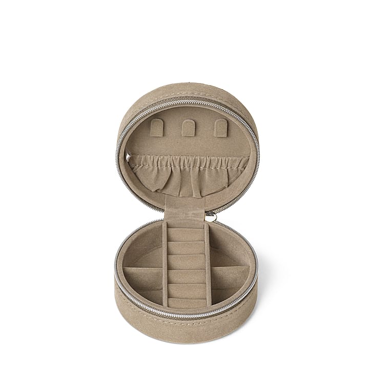 Dette runde smykkeskrin er designet i velour med quilt detaljer, og fortil har det Day Et logoet i sølv. Det lukkes med en lynlås, og indeni har det små rum, så du kan organisere dine smykker.
