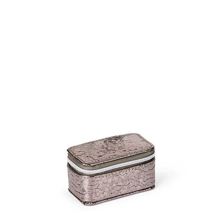 Det krakelerede shiny materiale og sølvfarvede lynlås giver et iøjnefaldende look i et kompakt format.
