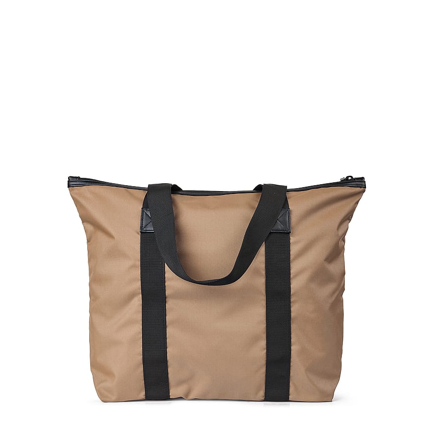 Tasken lukkes med en lynlås, og den har lange stropper, som gør det behageligt at bære tasken over skulderen.