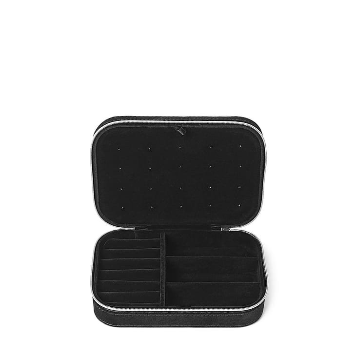 Det lukkes med en lynlås, og indeni har det flere rum, så du kan organisere dine smykker.