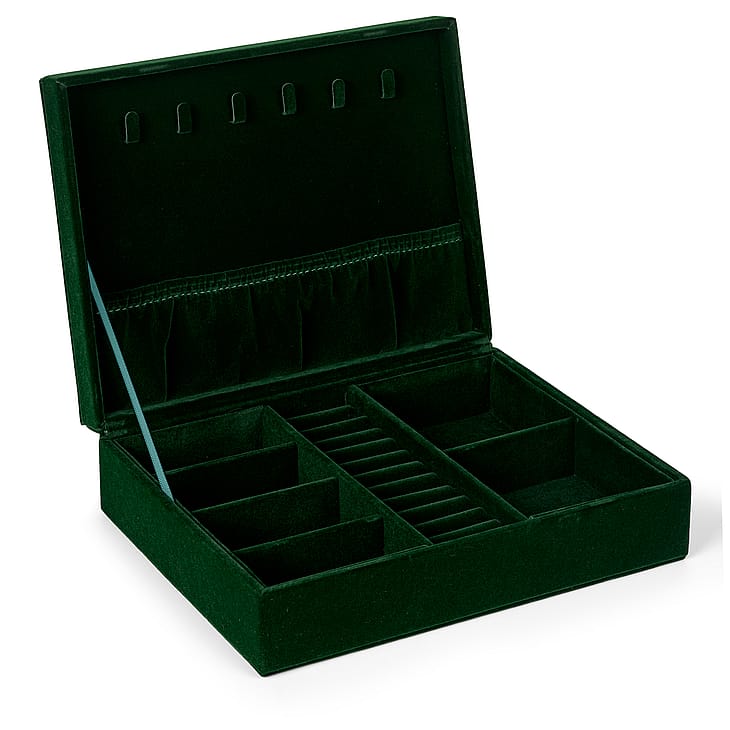 De mange rum gør det nemt at organisere smykker, og låget har kroge til halskæder.