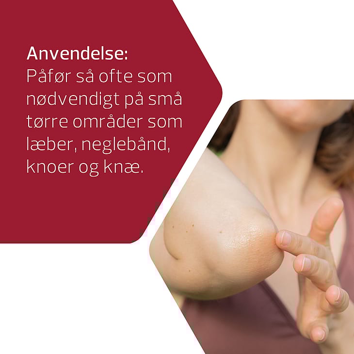 - Kan bruges på tørre og sprukne læber, flossede neglebånd, smårifter og små tørre pletter på huden.