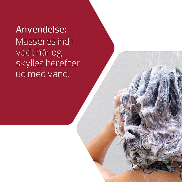 Påfør shampoo i vådt hår og hovedbund med bløde, masserende bevægelser.