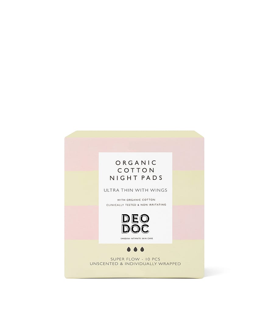 Derfor har vi med stolthed udviklet 100 % økologiske bomuldspuder, som er et åndbart materiale, der hjælper med at forhindre fugt, irritation og lugt med en overlegen absorberingsevne og friskhed, der er sammenlignet med syntetiske foringer. I modsætning til syntetiske materialer er bomuld komposterbart og biologisk nedbrydeligt, hvilket gør DeoDocs natpude godt for vulvaen.