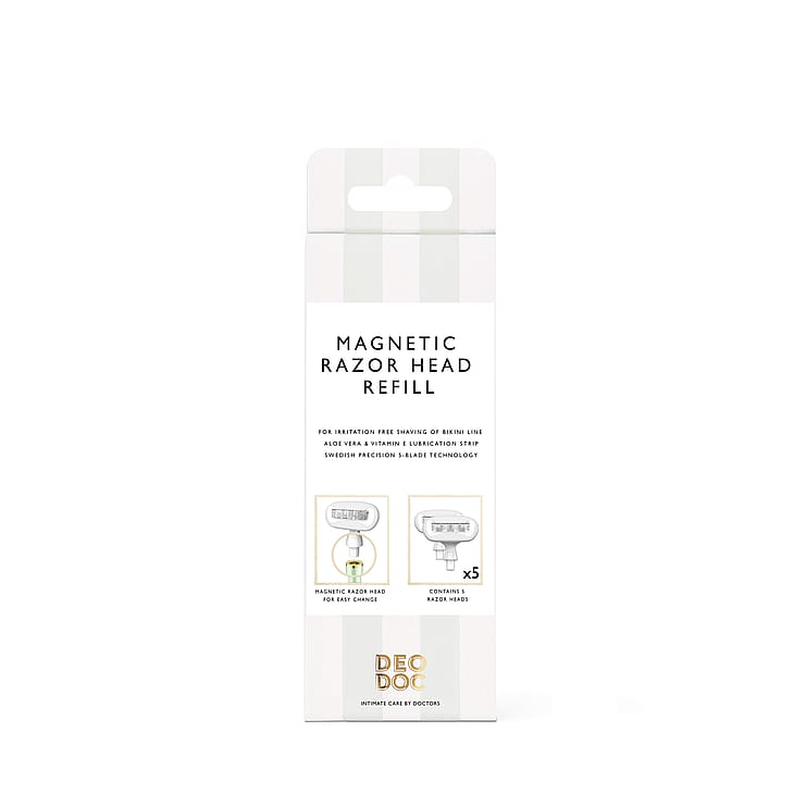 Magnetic Razor Head Refill fra DeoDoc indeholder 5 magnetiske barberblade, specielt udviklet til at give en blid og tæt barbering. De magnetiske hoveder gør det nemt og sikkert at skifte blade, samtidig med at de sikrer at barberbladene ikke løsner sig under brug. Disse barberblade er kompatible med DeoDoc Intimate Shaving Razor og er ideelle til en glat og behagelig barberingsoplevelse.
