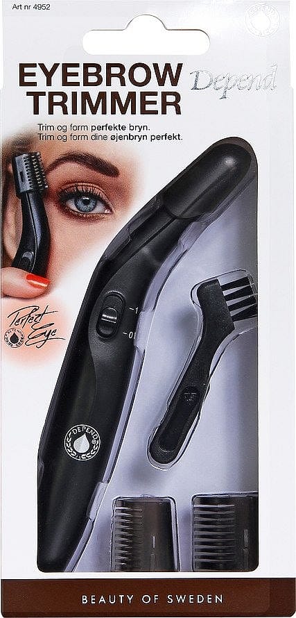 "At plukke øjenbrynshårene er altid smertefuldt og tidskrævende, men der findes heldigvis andre metoder til, at gøre sine bryn pæne og velplejede. Med Depend Cosmetic Eyebrow Trimmer kan du smertefrit og hurtigt ordne dine øjenbryn. Du kan også trimme længden på dine hår ved hjælp af de medfølgende kamme. Den fungerer også som en ”let barbering” af overlæben, under armene, ved bikinilinjen osv. Trimmeren bruger 1 stk. AAA-batteri (medfølger ikke). Rengøringsbørste er med i pakken. "
