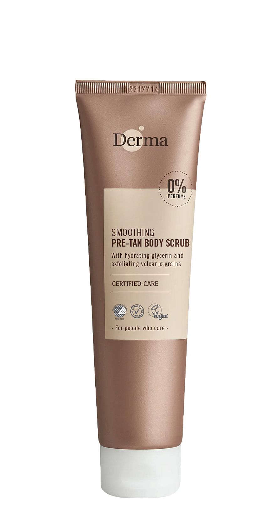 Derma Pre-Tan Body Scrub er allergivenlig, parfumefri, Svanemærket samt certificeret vegansk.