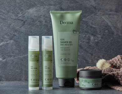I Derma Man-serien finder du 3i1-shower gel, ansigtscreme og ansigtsgel samt anti-perspirant deo-roll on til mænd. Produkterne er fyldt med aktive ingredienser som sheabutter, E-vitamin og naturlige olier.