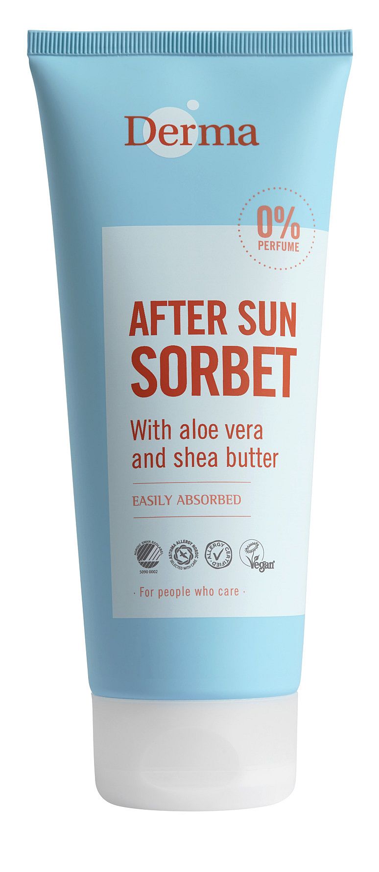 Derma After Sun Sorbet er allergivenlig, parfumefri, Svanemærket samt certificeret vegansk.