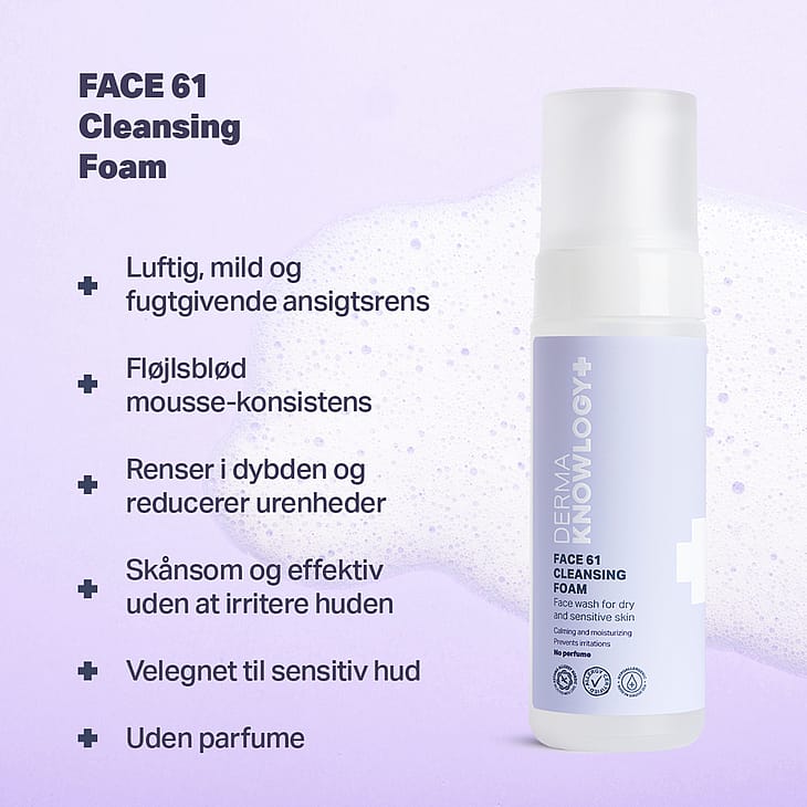 FACE 61 Cleansing Foam er en luftig, mild og fugtgivende ansigtsrens, der renser huden i ansigtet yderst skånsomt og effektivt. Den lækre og fløjlsbløde mousse-konsistens er særligt velegnet til den sarte og tørre ansigtshud. Den renser i dybden og reducerer urenheder uden at irritere eller udtørre huden.