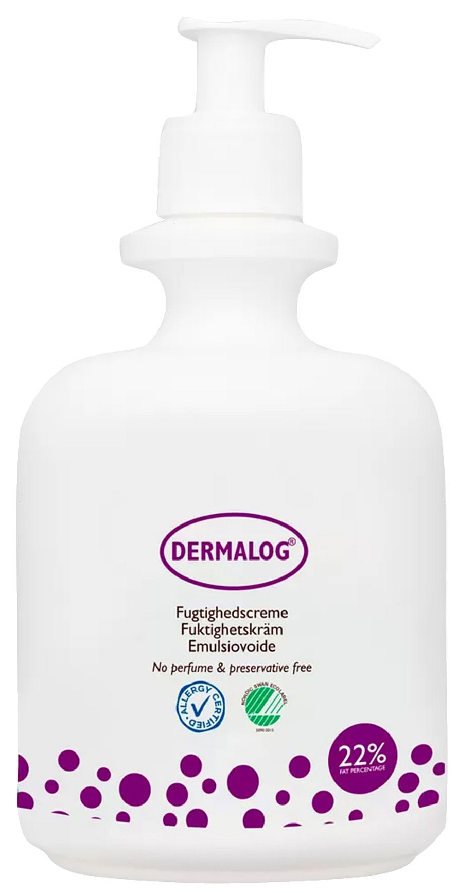 DERMALOG Fugtighedscreme med 22% fedt er en fugtighedscreme uden parfume til normal og tør hud. Cremen har en langtidsvirkende fugtgivende effekt på både ansigt og krop, samtidigt med at den dæmper kløe og modvirker udtørring af huden. Derudover er den både AllergyCertified og Svanemærket og så har den en grøn kolbe i Kemiluppen. Cremen kan med fordel bruges som bodylotion, ansigtscreme eller endda håndcreme.