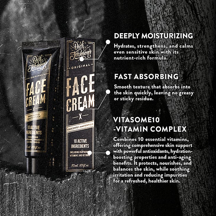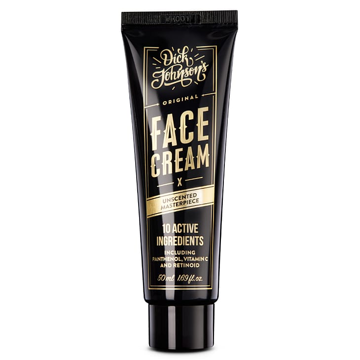Dick Johnson’s Face Cream Masterpiece er en kraftfuld kombination af 10 vitaminer, naturlige ekstrakter og panthenol. Det er en beroligende, styrkende og energigivende ansigtscreme til mænd, der hjælper din hud med at føles frisk og sund igen. Takket være sin lette tekstur absorberes den hurtigt uden fedtet eller klæbrig rest.