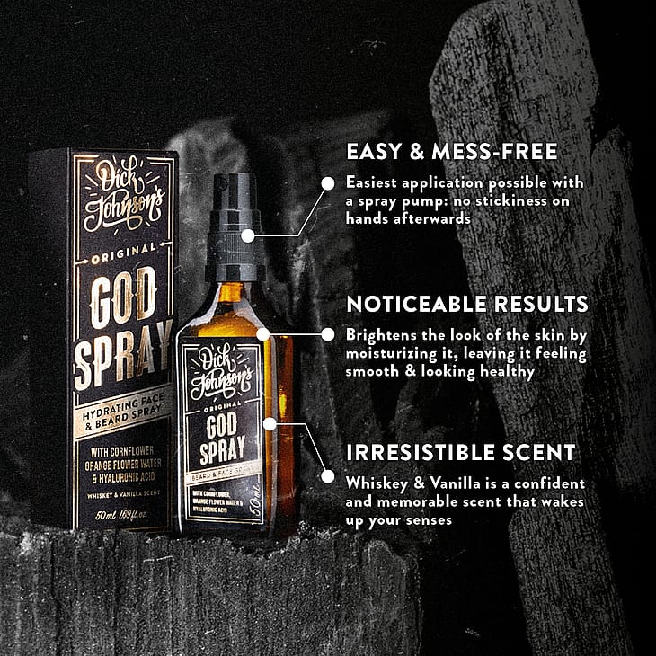 Dick Johnson’s God Spray er en revolutionerende spraybar ansigtsfugtighedscreme til mænd, fyldt med naturlige ingredienser, der hjælper med at lindre stress og berolige din hud. Den lækre Whiskey & Vanilje duft giver din dag et luksuriøst touch—som en fancy cocktail til dit ansigt, uden tømmermænd.