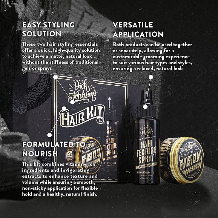 Dick Johnson’s Hair Kit er designet til at opfylde alle mænds behov for hårstyling. Sættet indeholder to af vores mest populære hårprodukter: Ghost Clay hårvoks og Hair Texture Spray.