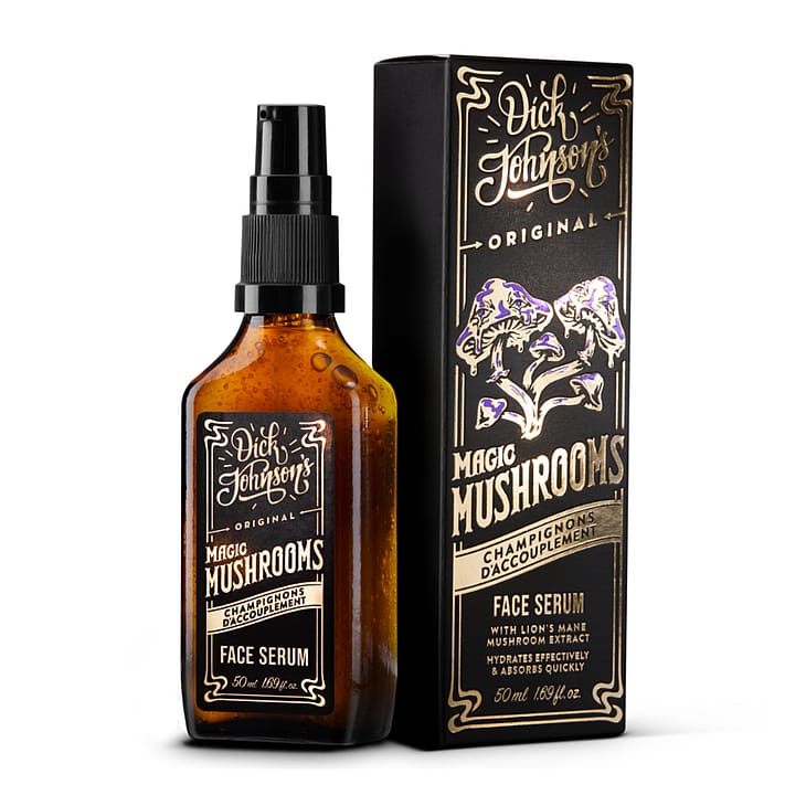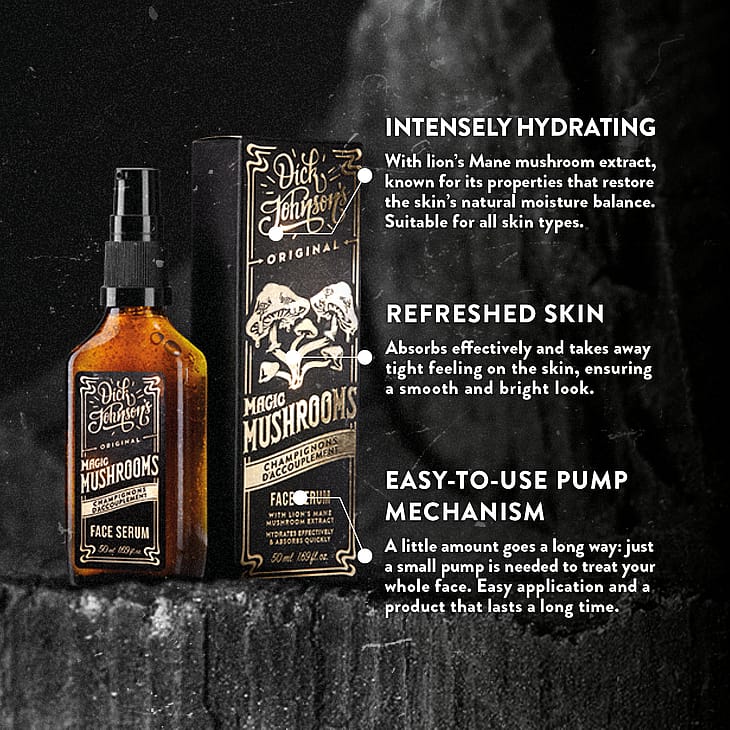 Dick Johnson’s Magic Mushrooms ansigtsserum er et dybt fugtgivende elixir til alle mænd! Packede med den magiske og hudbalancerende Lion’s Mane svampeekstrakt hjælper denne serum med at glatte, rense og fugte din hud i dybden.