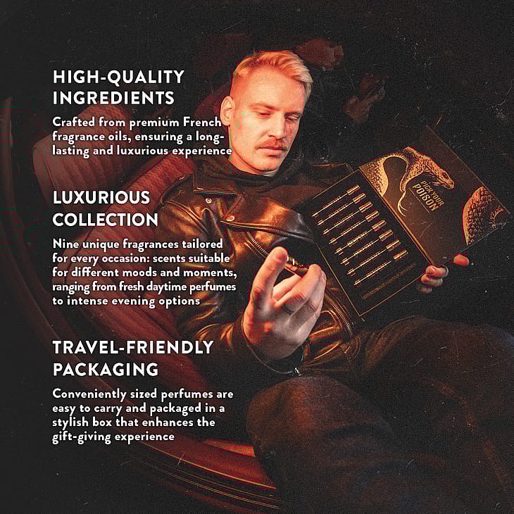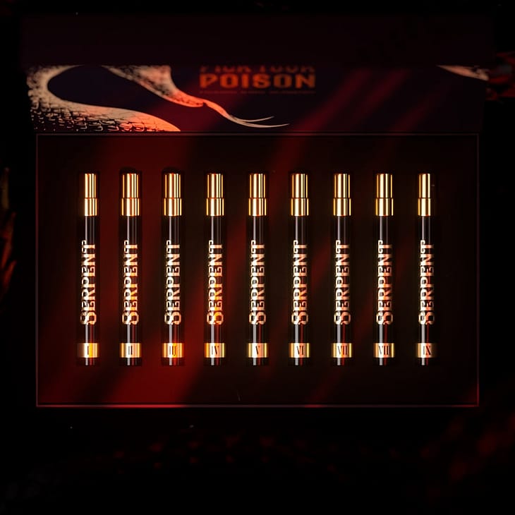 Serpent 1: Ingredients:Alcohol Denat., Parfum (Fragrance), Aqua (Water), Limonene, Linalool, Citral, Benzyl Salicylate, Coumarin, Geraniol, Eugenol, Citronellol. Vegan friendly. Serpent 2: Ingredients:Alcohol Denat., Parfum (Fragrance), Aqua (Water), Limonene, Linalool, Citronellol, Coumarin, Citral, Alpha-Isomethyl Ionone, Benzyl Alcohol, Eugenol, Geraniol, Methyl 2-Octynoate, Cinnamal. Vegan friendly. Serpent 3: Ingredients:Alcohol Denat., Parfum (Fragrance), Aqua (Water), Linalool, Limonene, Alpha-Isomethyl Ionone, Benzyl Salicylate, Citronellol, Citral, Coumarin, Geraniol. Vegan friendly. Serpent 4: Ingredients:Alcohol Denat., Parfum (Fragrance), Aqua (Water), Benzyl Salicylate, Limonene, Linalool, Alpha-Isomethyl Ionone, Eugenol, Citral, Isoeugenol, Citronellol, Geraniol. Vegan friendly. Serpent 5: Alcohol Denat., Parfum (Fragrance), Aqua (Water), Limonene, Linalool, Alpha-Isomethyl Ionone, Coumarin, Citral, Citronellol, Geraniol. Vegan friendly. Serpent 6: Alcohol Denat., Parfum (Fragrance), Aqua (Water), Limonene, Hydroxycitronellal, Linalool, Coumarin, Citral. Vegan friendly. Serpent 7: Alcohol Denat., Parfum (Fragrance), Aqua (Water), Coumarin, Limonene, Linalool, Benzyl Benzoate, Citronellol, Citral, Benzyl Cinnamate, Isoeugenol, Alpha-Isomethyl Ionone, Geraniol, Eugenol, Benzyl Alcohol. Vegan friendly. Serpent 8: Alcohol Denat., Parfum (Fragrance), Aqua (Water), Alpha-Isomethyl Ionone, Linalool, Citronellol, Geraniol, Coumarin, Cinnamyl Alcohol, Benzyl Benzoate, Limonene, Benzyl Cinnamate, Citral, Farnesol, Isoeugenol, Cinnamal, Eugenol, Benzyl Alcohol. Vegan friendly. Serpent 9: Alcohol Denat., Parfum (Fragrance), Aqua (Water), Citronellol, Linalool, Farnesol, Geraniol, Limonene, Eugenol, Benzyl Benzoate. Vegan friendly.