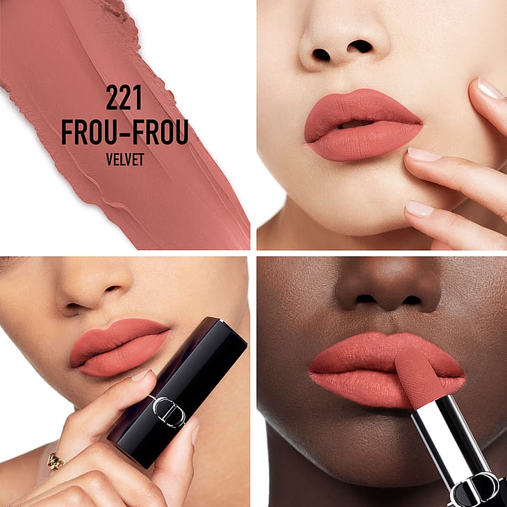 Den matte fløjlsfinish har en omsluttende, formbar konsistens, der giver fyldige og bløde læber. Uden at gå på kompromis med komforten har den en nærmest usynlig fornemmelse, der efterlader læberne fyldige og ensartede. Stiften er dekoreret med et mønster inspireret af stoffer fra Diors kollektioner.