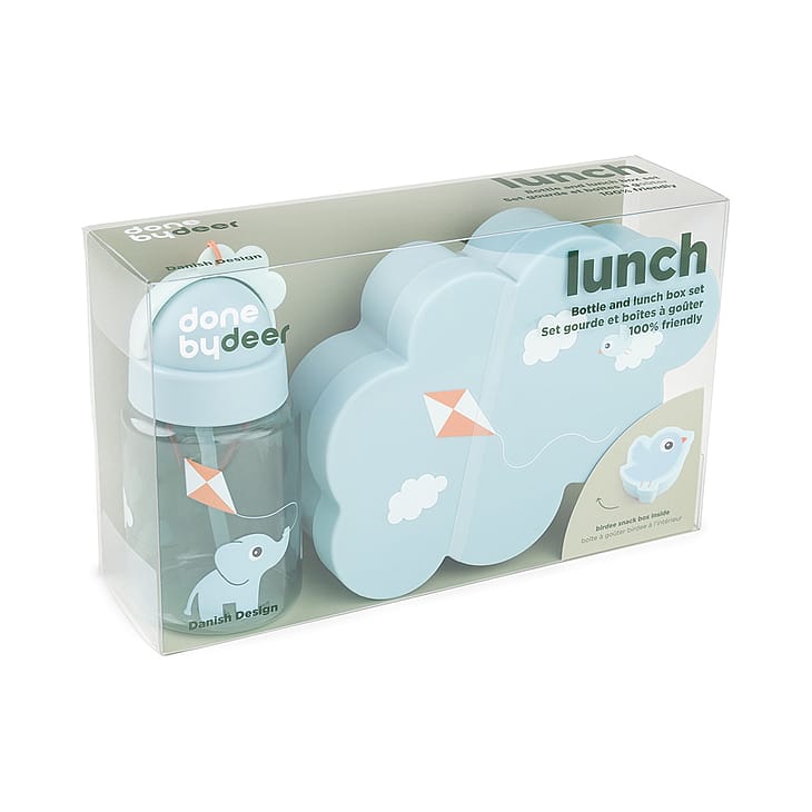 Dette blå sæt indeholder drikkedunk med sugerør, en snackboks og en madkasse.