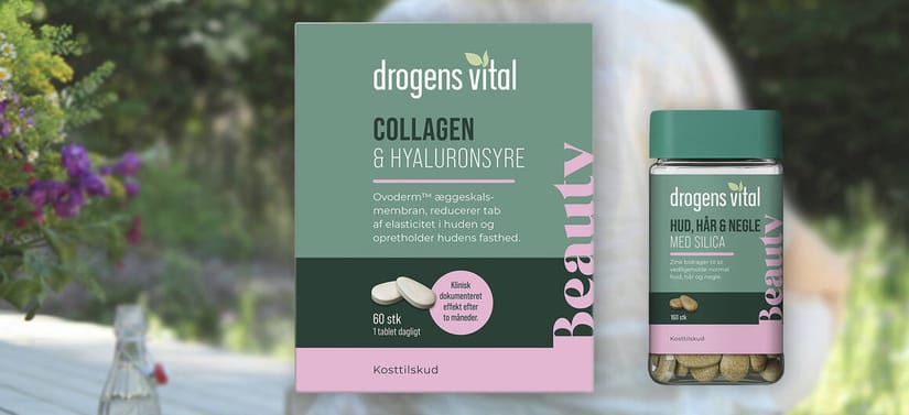 Beauty er til dig, der ønsker at støtte din hud, dit hår og dine negle indefra. Serien består af Collagen med hyaluronsyre samt Drogens Vital Hud, Hår & Negle med silica, som er specielt sammensat til dig, der vil gøre noget ekstra for din hud, dit hår og dine negle. Udover planteekstrakt af agerpadderokke, som indeholder silica, indeholder Drogens Vital Hud, Hår & Negle også ølgær, C-vitamin, 6 forskellige B-vitaminer samt mineralerne selen, jod, kobber og zink. Kobber bidrager til at vedligeholde normalt bindevæv, mens zink bidrager til vedligeholdelse af normalt hår, normal hud og normale negle.