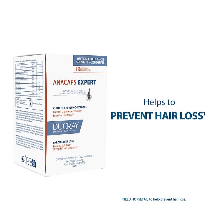 ProduktbeskrivelseDucray Anacaps Expert Chronic Hairloss er et kosttilskud mod vedvarende hårtab hos både mænd og kvinder. Kapslerne er formuleret med plantebaserede aktive ingredienser, aminosyrer, vitaminer og mineraler for at imødekomme behovene ved kronisk hårtab. Venushår-bregne hjælper med at bevare sundt hår og negle og bidrager til at modvirke hårtab, mens blåbær stimulerer mikrocirkulationen i hårbunden, så hårsækkene får optimale vækstbetingelser. Zink og jern hjælper med at opretholde normalt hår og beskytter cellerne mod oxidativt stress, mens vitamin B6 og B8 (biotin) bidrager til sundt hår ved at støtte dannelsen af de proteiner, håret består af.
