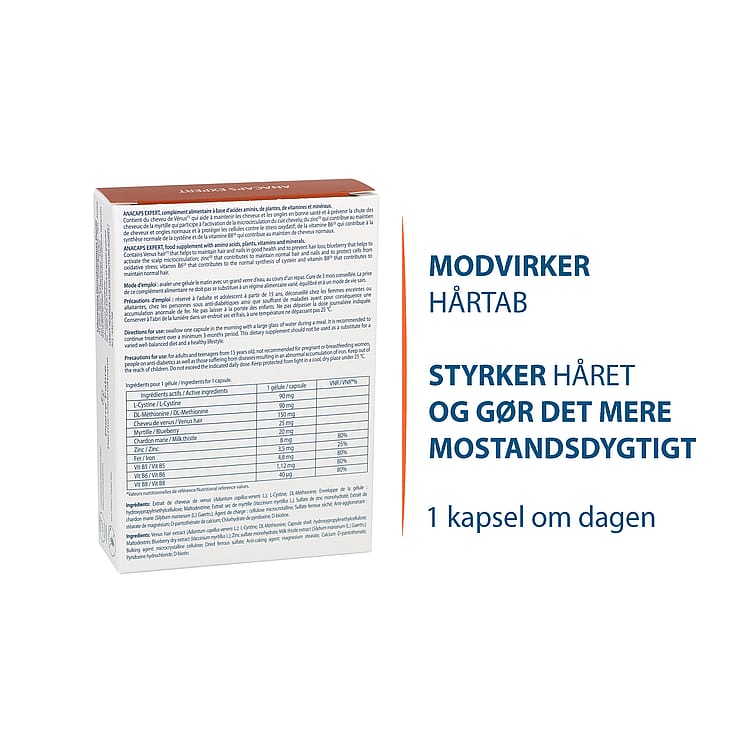 Anacaps Expert er vegansk, glutenfri og dækker 80% af det daglige behov for biotin. Det anbefales at indtage 1 kapsel dagligt i minimum 3 måneder. Kosttilskuddet må kun indtages af voksne og teenagere fra 15 år. Anbefales ikke til gravide eller ammende kvinder, personer der tager medicin mod diabetes eller personer med en sygdom, der resulterer i unormal ophobning af jern. Opbevares utilgængeligt for børn.