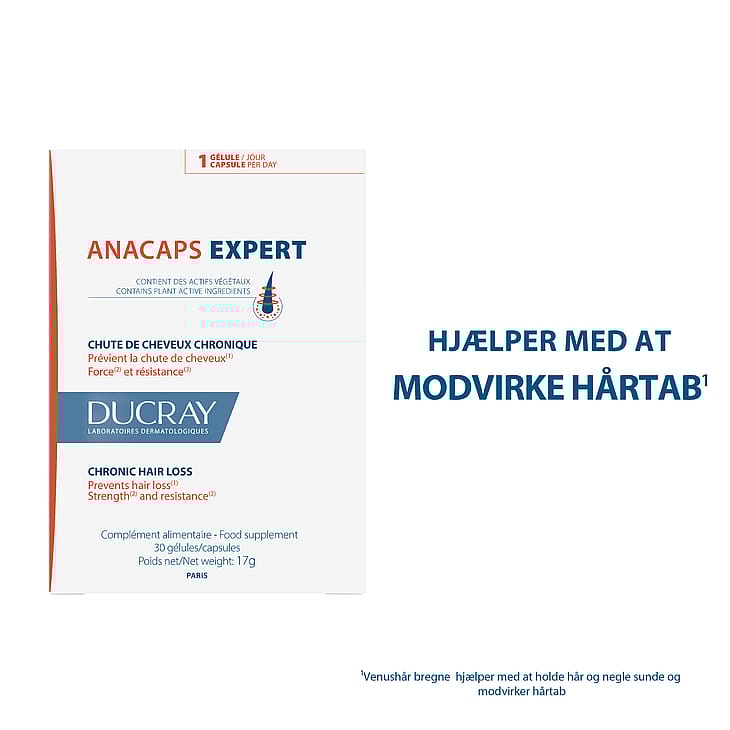 ProduktbeskrivelseDucray Anacaps Expert Chronic Hairloss er et kosttilskud mod vedvarende hårtab hos både mænd og kvinder. Kapslerne er formuleret med plantebaserede aktive ingredienser, aminosyrer, vitaminer og mineraler for at imødekomme behovene ved kronisk hårtab. Venushår-bregne hjælper med at bevare sundt hår og negle og bidrager til at modvirke hårtab, mens blåbær stimulerer mikrocirkulationen i hårbunden, så hårsækkene får optimale vækstbetingelser. Zink og jern hjælper med at opretholde normalt hår og beskytter cellerne mod oxidativt stress, mens vitamin B6 og B8 (biotin) bidrager til sundt hår ved at støtte dannelsen af de proteiner, håret består af.