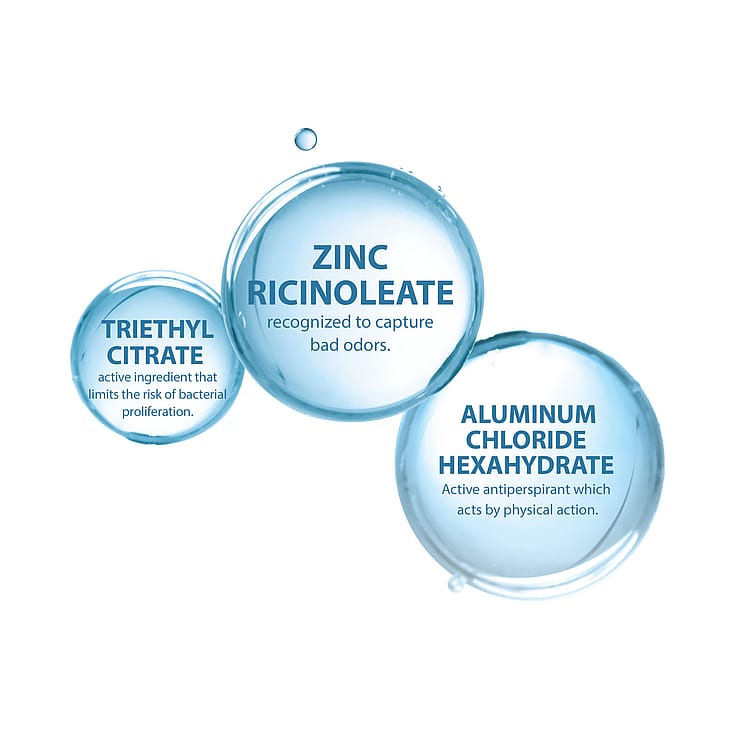 Produktet indeholder tre aktive ingredienser: Zink Ricinoleat, som effektivt neutraliserer lugt, Aluminiumsalte, der reducerer svedproduktion, og Triethyl Citrate, som absorberer fugt og renser huden. Cremen har en let og behagelig konsistens, der hurtigt trænger ind i huden uden at efterlade klæbrige eller fedtede mærker, og den er formuleret uden parfume og alkohol for at sikre høj tolerance på sart hud. Den antiperspirante creme er velegnet til daglig brug og giver en effektiv, skånsom og langvarig kontrol af svedproduktion og ubehag forårsaget af fugt og lugt.