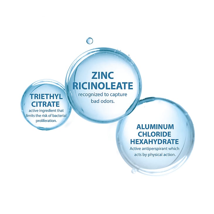 De aktive ingredienser Zinc Ricinoleate, aluminiumssalte og Triethylcitrat absorberer fugt, reducerer svedproduktionen, opfanger lugt og renser huden. Risstivelse komplementerer virkningen af aluminiumssaltene ved at absorbere fugt. Deodoranten er udviklet med særlig omtanke for sensitiv hud og indeholder ingen parfume eller alkohol. Den lette konsistens trænger hurtigt ind i huden og efterlader ingen mærker på tøjet.