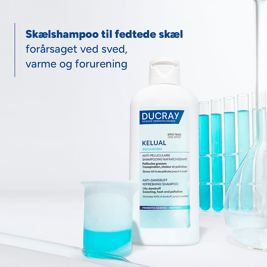 Ducray Kelual Squanorm Refreshing Shampoo er en opfriskende og kølende shampoo udviklet til hårbund med fedtede skæl, som kan være forårsaget af sved, varme eller forurening. Shampooen kombinerer effekt på talgproduktionen med en kølende fornemmelse, der giver øjeblikkelig friskhed og komfort til hovedbunden.
